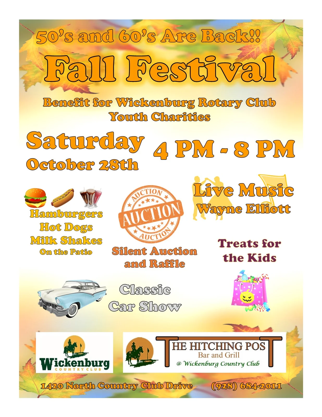 50’s and 60’s Themed fundraising event for the Wickenburg Rotary Club Youth Charities. Live music from Wayne Elliott. Specials on Burgers, Hot Dogs, and Milk Shakes made on the Patio, Classic Car Show, Fun Games and Activities, Silent Auction Items and Raffle Prizes.