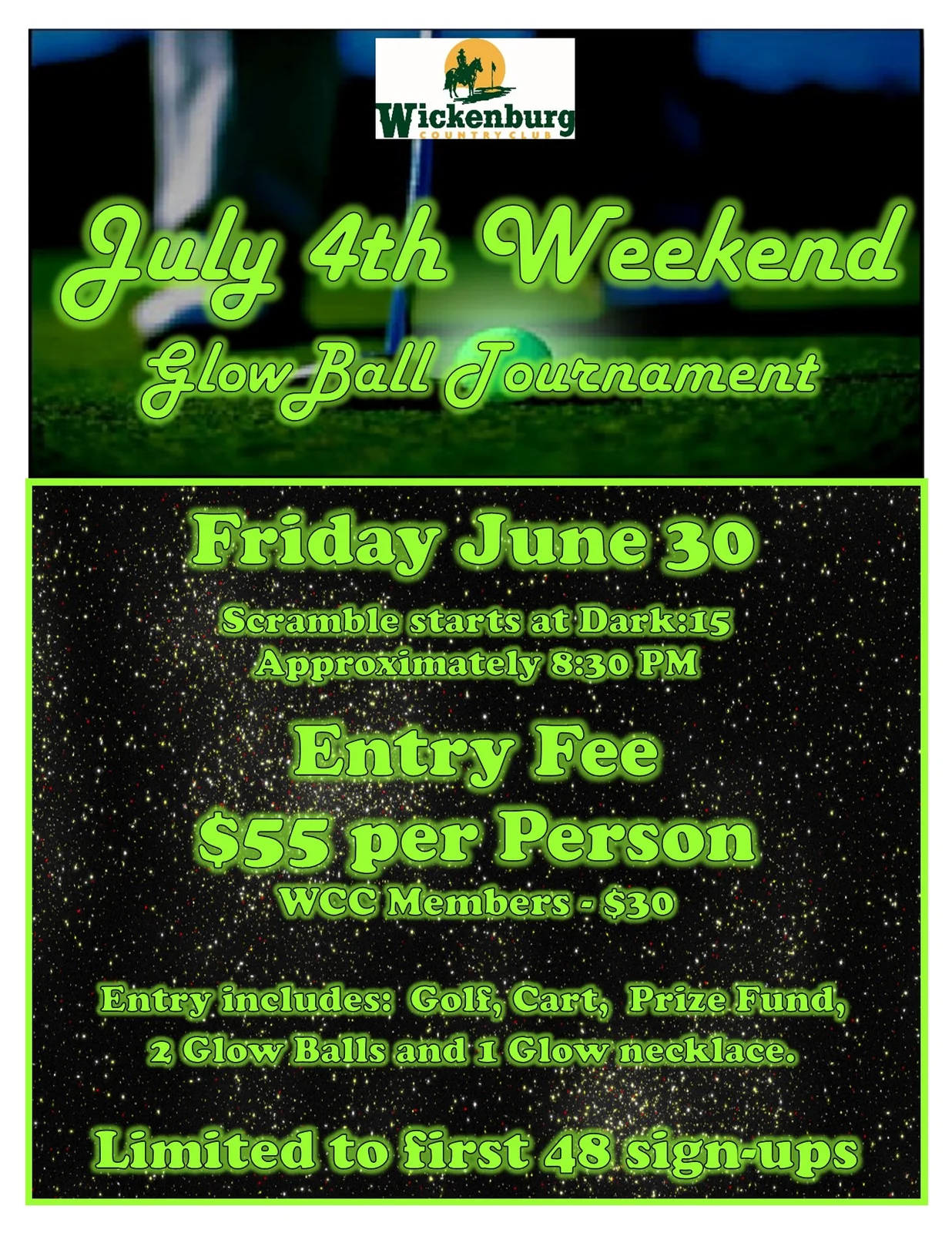 Glow Ball Tournament Call Golf Shop for details + Add to Google Calendar + iCal / Outlook export Date Jun 30 2023 Expired! Time 8:00 pm - 11:00 pm Category Tournaments Share this event