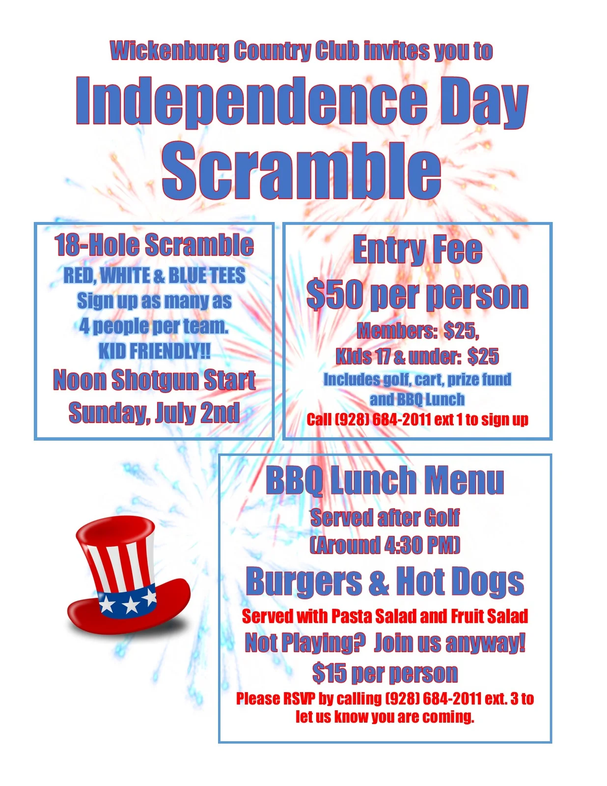 Independence Day Scramble Entry Fee: $55 Includes Golf, Cart, Prize Fund, and BBQ after Golf + Add to Google Calendar + iCal / Outlook export Date Jul 02 2023 Expired! Time 12:00 pm - 6:00 pm Category Tournaments Share this event